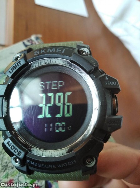 Relógio tipo Gshock com diversas funções entre elas: Fuso horário normal e segundo horário, pedometro, 2;alarmes, contagem decrescente, pacer /metrometro, barometro, temperatura, previsão de tempo.
