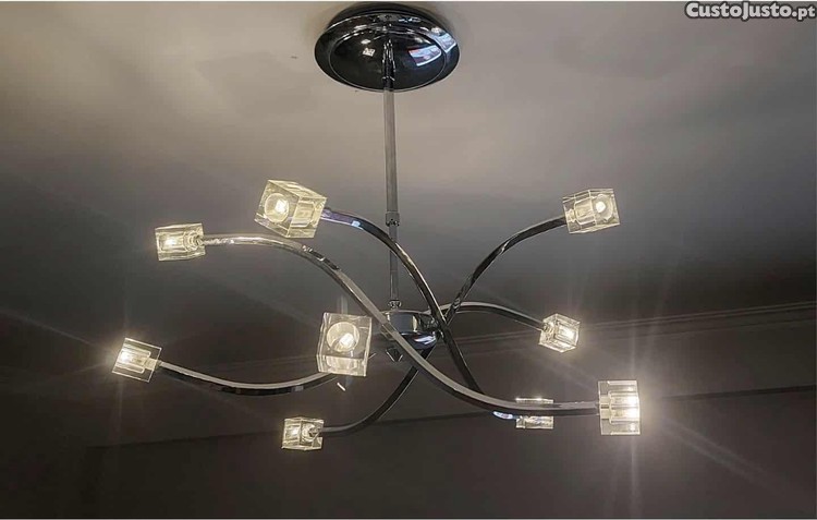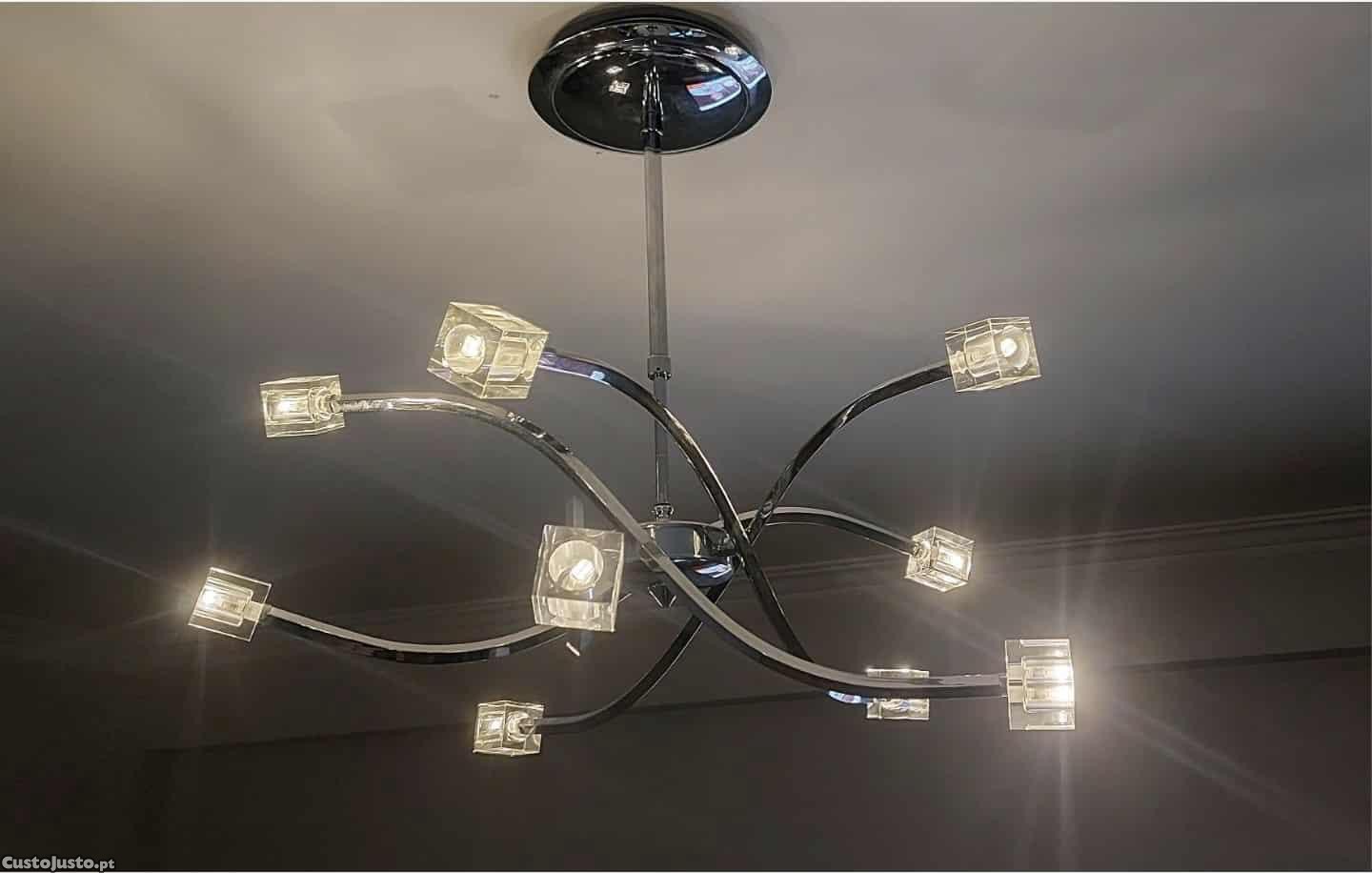 Candeeiro de traçado contemporâneo, estimado. Os braços são reguláveis e dispõem de 10 luzes
