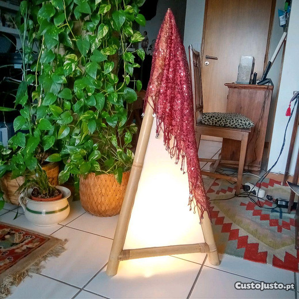 Candeeiro de artesanato oriental em bambu. Tem iluminação a funcionar. Cerca de 1m de altura. O lenço não faz parte.