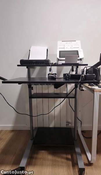 Mesa móvel ajustável, ideal para escritórios em casa, ambientes de trabalho ou pequenos negócios. Perfeita para suportar impressoras, scanners, laptops e outros equipamentos de escritório. A altura ajustável permite o uso confortável tanto em pé quanto sentado, e as rodas facilitam a movimentação entre ambientes. Estrutura em metal com prateleiras laminadas pretas. Cor preta e cinza. A montagem é fácil.A entrega em Porto, Aveiro e Figueira da Foz é possível; para outras cidades, existe a opção de envio por correio, sendo o custo dos portes por conta do comprador.basta enviar mensagens de texto no WhatsApp, não ligar.