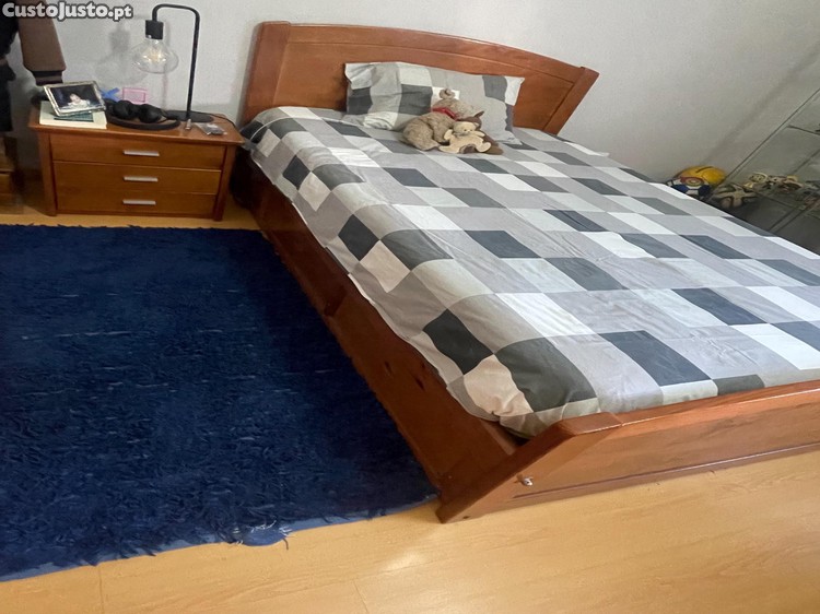 Mobília de quarto completa, composta por cama com 2 gavetas de arrumação + estrado + colchão de 1,90m x 1,20m, mesinha de cabeceira (A: 47cm x L: 53,5cm x P: 37,5cm), escrivaninha (A: 1,97m x L: 1,00m x P: 57,5cm) e cómoda (A: 83cm x L: 99cm x P: 44cm). Poderei fazer entrega sem custos num raio de 30km. Distâncias superiores a 30km, levantamento onde se encontra e transporte a cargo do comprador ou, também, poderei entregar mediante ajuste de preço.