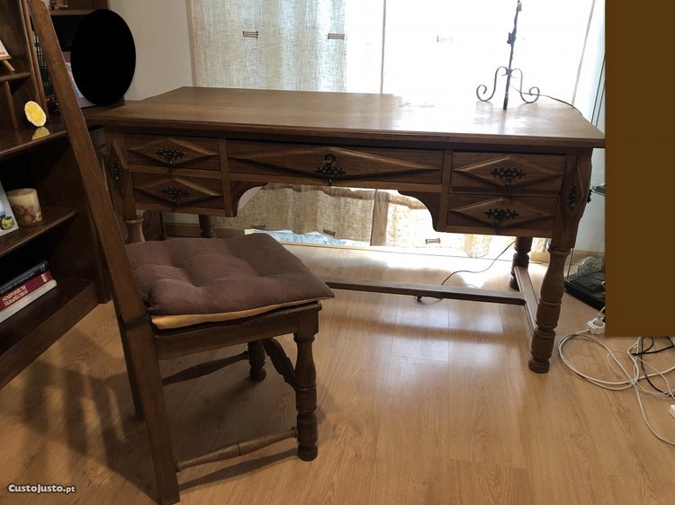 Secretária e cadeira (sem candeeiro) usada castanho maciço.