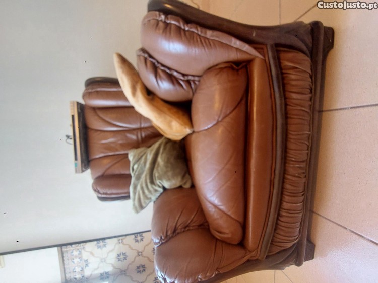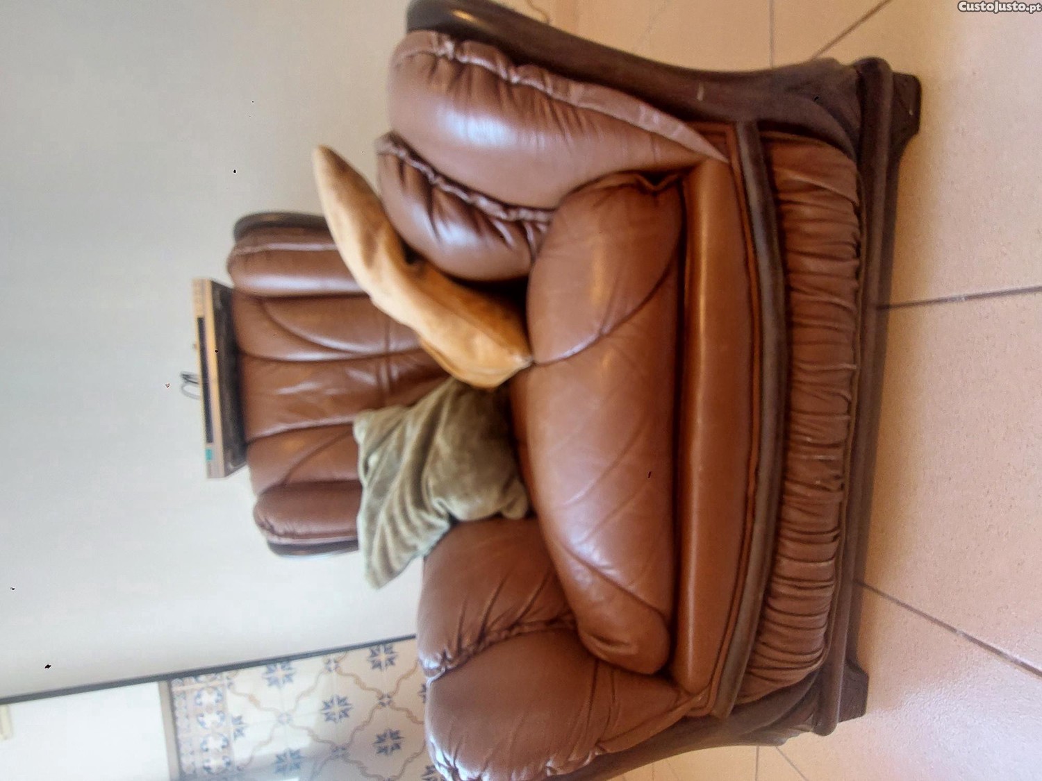 Sofá individual, em pele verdadeira e acabamento de madeira, com 80cm/90cm. Usado, mas em bom estado. O preço engloba um leitor de DVD marca Sony e almofadas presentes nas fotos.