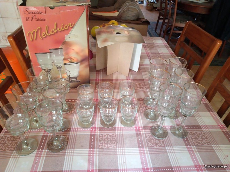 Preço: 10 €Conjunto de 18 copos na caixa original, 3 conjuntos diferentes de 6 unidades