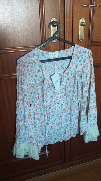 Blusa da Maitté em branco com flores em tijolo, azul e verde.