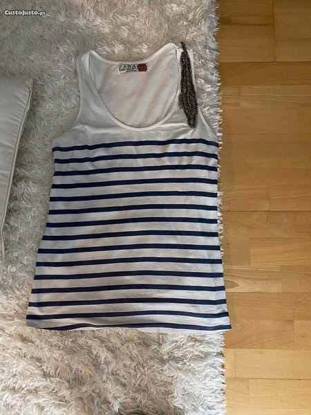 Preço: 5 €top zara azul às riscas tamanho m com aplique com brilhantes no ombro