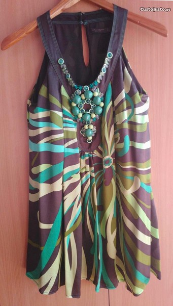 Vestido em vários tons de verde, com forro, da Zara Woman, tamanho S. Tem apliques no decote. Mede, desde o declive do decote até à bainha, cerca de 65 cm. Está novo. Envio para todo o país.