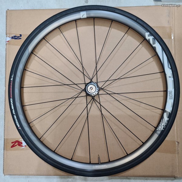 Rodas Estrada Fulcrum Racing 600 DB + Pneus Vittoria Rubino Graphene 2.0 700x25c + Cepo Shimano 11v Inclui: - Rodas Estrada Fulcrum Racing 600 DB, com apenas 500kms (como novas, sem riscos ou mossas) - Pneus Vittoria Rubino Graphene 2.0 700x25c, com apenas 500km (sem cortes ou danos) - 2x Câmaras de ar com válvulas Presta - Cepo para cassete Shimano 10/11V Como novas, utilizadas apenas durante 500kms, sem danos, empeno ou riscos. São iguais às Fulcrum Racing 6 DB, só mudam na cor dos autocolantes. Esta versão foi criada para equipar de origem algumas marcas de bicicletas. Vendo porque substituí por carbono e ganhei alguns gramas. Os pneus estão também em excelente estado e apresentam um comportamento exemplar. Para os interessados informo que tenho ainda um saco de rodas Fulcrum, novo, para venda por 40EUR. A quem levar o conjunto saco e rodas ou saco, rodas e discos faço um desconto. Negócio em mãos em Coimbra ou arredores, ou envio por correio mediante pagamento antecipado, por MBWay ou Transferência Bancária. Neste caso os portes de correio registado ou expresso ficam a cargo do comprador. Especificações: - Modalidade: Estrada - Diâmetro da roda: 28 - Tipo de pneu: com câmara de ar, tubeless (tem que levar fita) - Peso: 1690g (par) - Material da roda: alumínio - Material da jante: alumínio - Altura do perfil: baixo - Altura da jante: 26 mm - Largura da jante: 21.8 mm, ETRTO 17C - Largura dos pneus: de 25 mm a 50 mm - Sistema de travagem: disco - Eixo dianteiro: 12x100mm (thru axle) - Eixo traseiro: 12x142mm (thru axle) - Número de raios: dianteiros 24/traseiros 24 - Cubo compatível: Shimano - Velocidades: 10, 11