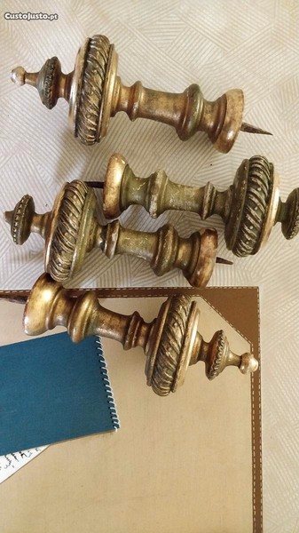Vendo 2 pares de suportes em madeira talha dourada, para reposteiros. Apesar de muito antigos, estão muito bem conservados. O preço é das 4 peças. Preço negociável.