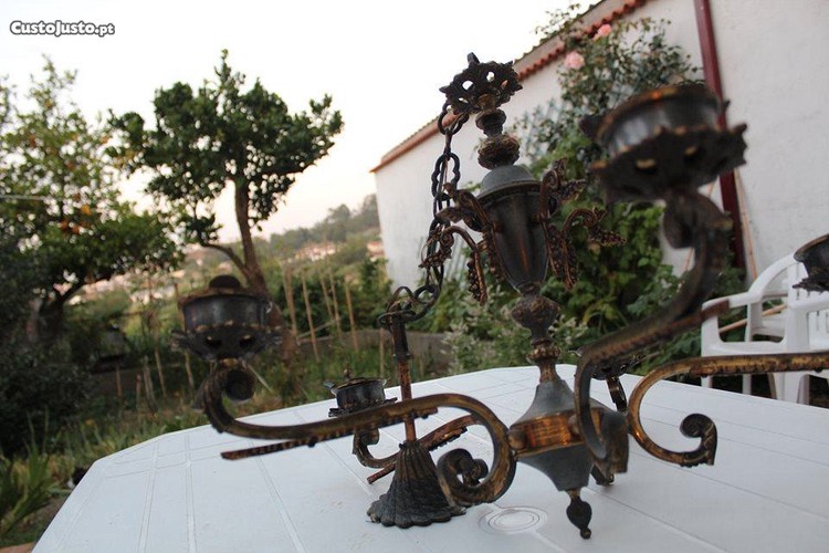 Candelabro de teto antigo em ferro dourado, trabalhado e em bom estado. Tem os cinco globos brancos completos e com lâmpadas incluídas. Tem os fios elétricos já montados.