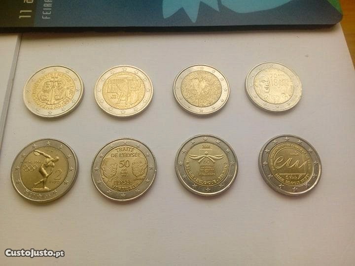 Moedas comemorativas de 2 euros variadas com a descrição abaixo: