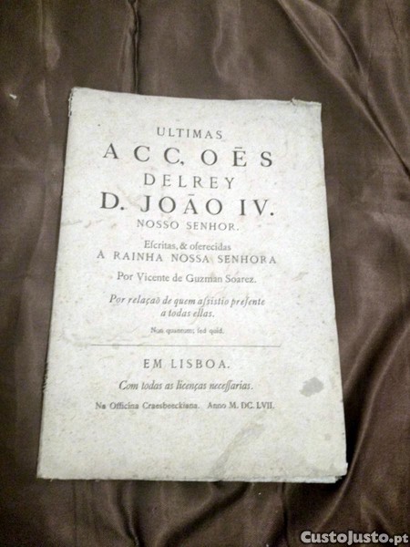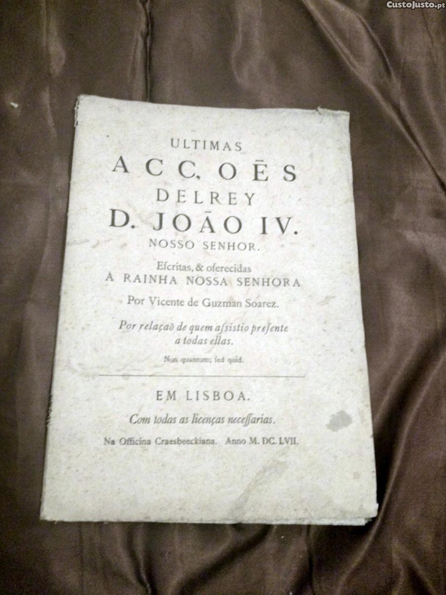 ÚLTIMAS ACÇÕES DEL REY D. JOÃO IV, NOSSO SENHOR. ESCRITAS E OFERECIDAS A RAINHA NOSSA SENHORA - por Vicente de Guzman Soarez, edição de 1940, impressa em Coimbra pelas oficinas gráficas da «Atlântida do original de 1657 dada à estampa em Lisboa pela Officina Craesbeeckiana. Em brochura.