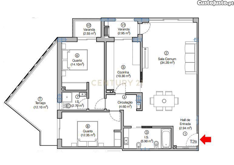 Com cerca de 74,35m², o apartamento é composto por uma sala espaçosa, uma cozinha totalmente equipada, dois quartos confortáveis, sendo um deles uma suíte, e duas casas de banho modernas. Além disso, dispõe de duas varandas, uma das quais com churrasqueira junto à cozinha, um arrumo prático e dois lugares de estacionamento cobertos. Um dos quartos tem acesso direto a um terraço privado de 12,1m², perfeito para momentos de descanso ao ar livre.