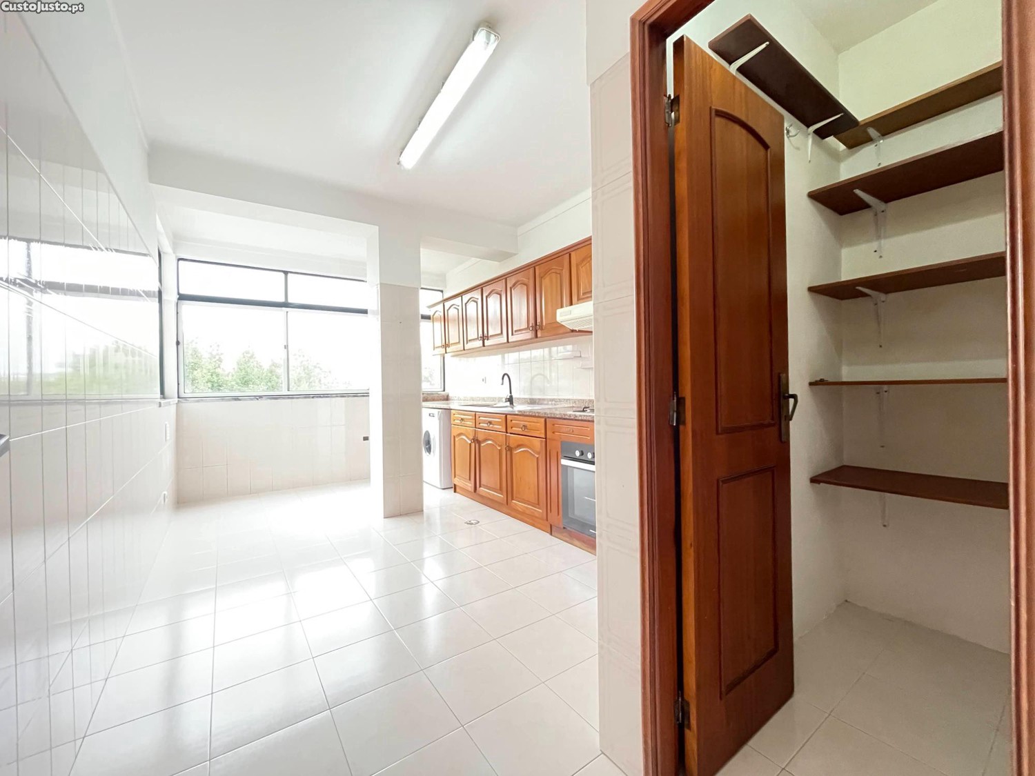 Cozinha equipada com fogão, forno, exaustor, esquentador e máquina de lavar roupa.
