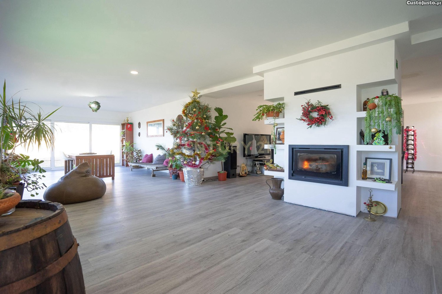 Piso r/c composto por hall de entrada, 1 quarto, 1 wc, sala ampla com lareira fechada dupla face e cozinha, dispensa e sala de estar com acesso a zona exterior de lazer com piscina.