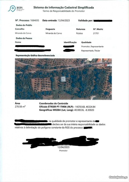 Terreno rústico sito no COVÃO, composto de terreno de mato com oliveiras com a área de 270 metros quadrados, na freguesia e concelho de Miranda do Corvo. Localização exacta do terreno - Coordenadas Geográficas WGS84 (Lat, Long): 40.88161, -7.72587