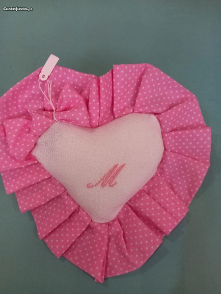 Almofada pequena de cor branca e rosa com a inicial "M"