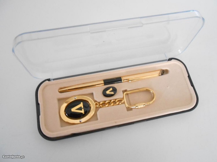 Bonito conjunto de esferográfica , porta chaves e pine em dourado