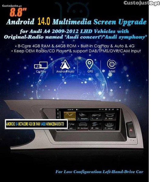 - Auto-radio android 14 , Octacore, 4 GB de RAM e 64 GB de Armazenamento, Modelo com CARPLAY - ANDROID AUTO - DSP, 4G.. Preço 330 eur