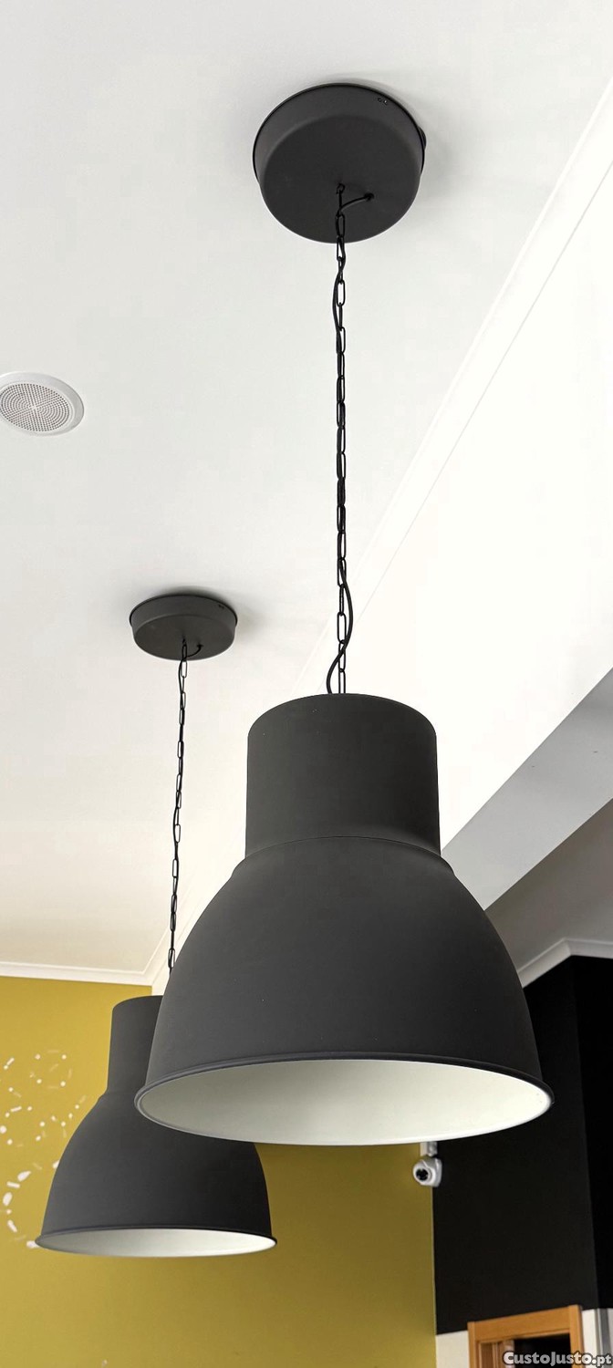 Candeeiros suspensos IKEA, modelo industrial, com 38cm de diâmetro. Ideais para espaços comerciais ou domésticos, criam uma iluminação dirigida e ambiente moderna. Vendidos usados, mas em excelente estado geral, perfeitos para criar ambiente em cozinhas, salas ou estabelecimentos. Disponibilidade: 16 unidades.