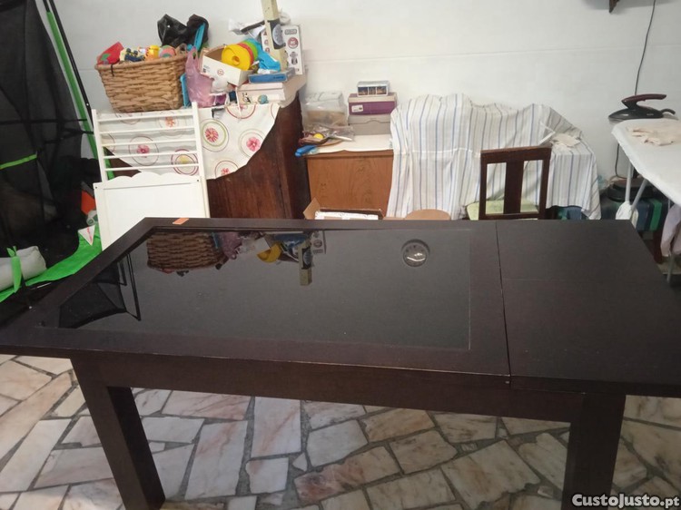 Extensível com tampo em madeira dobrado debaixo do vidro.