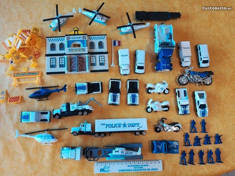 Muitas miniaturas de carros, aviões, helicópteros, figuras, máquinas pesadas, tanque de guerra, etc. Alguns carros são HotWheel.