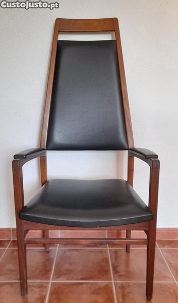 Cadeirão centenário em madeira e cabedal. O assento mede 50 cm de profundidade e tem de largura na parte mais larga 55 cm e na menos larga 46 cm. Tem de altura máxima 136 cm. Em excelente estado. Peça de museu.