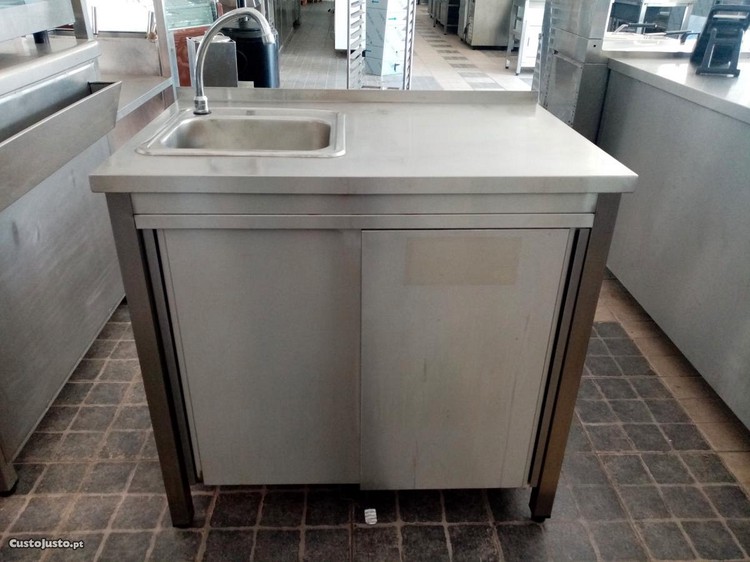 Descrição: Bancada de lavagem em inox com 1 cuba, e 2 portas de correr. Com torneira misturadora.