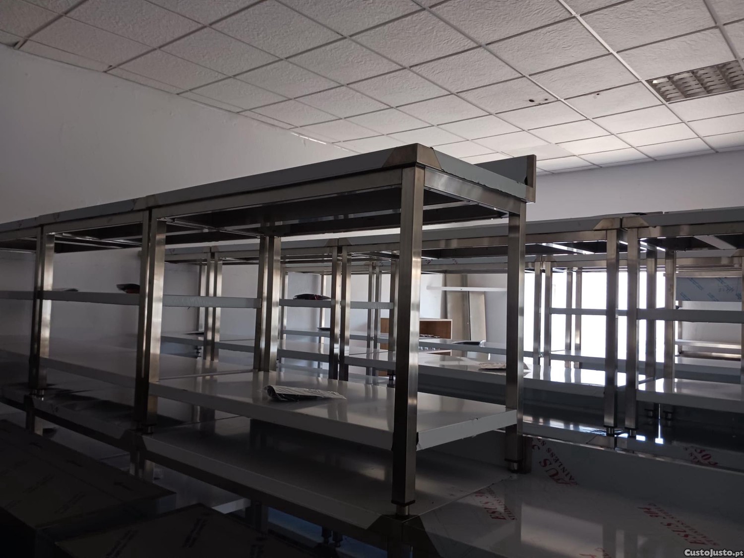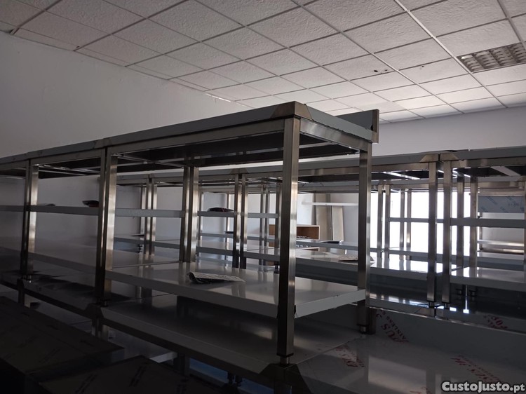 Descrição: Bancada mural em inox com alçado posterior, com 1 prateleira.