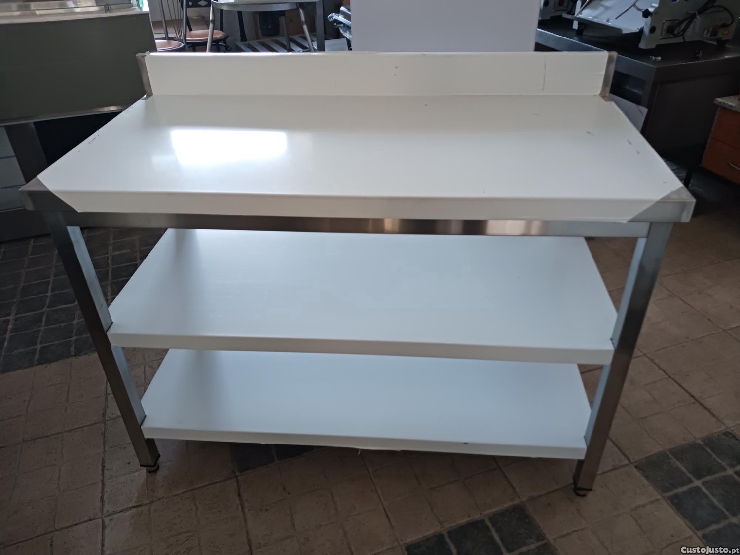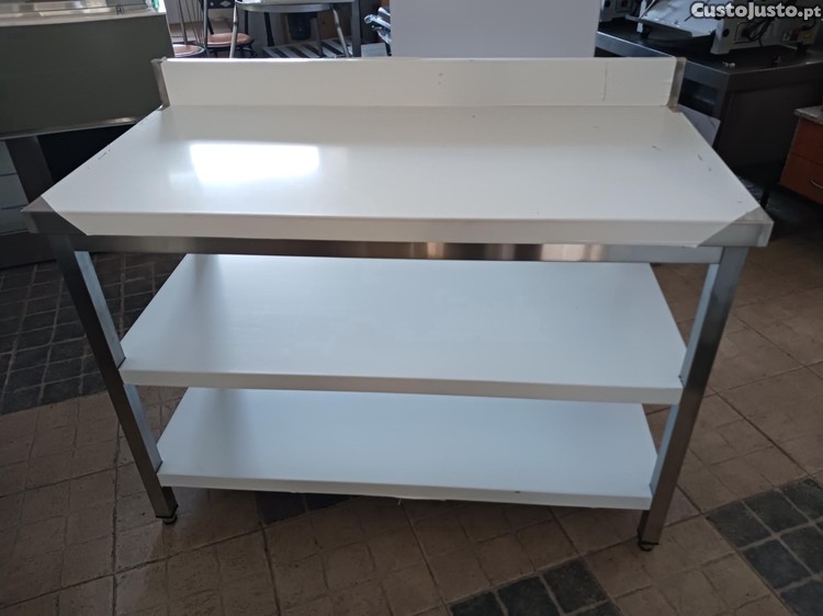Descrição: Bancada mural em inox com alçado posterior, com 2 prateleiras.