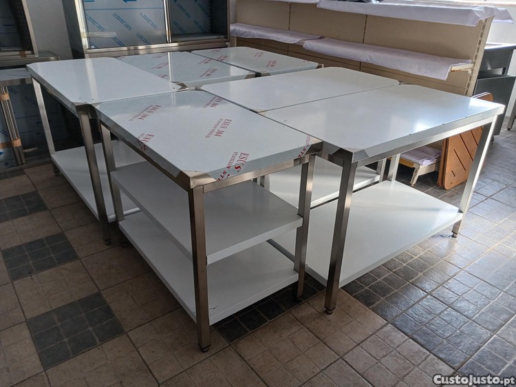 Descrição: Bancada central em inox, com 2 prateleiras.