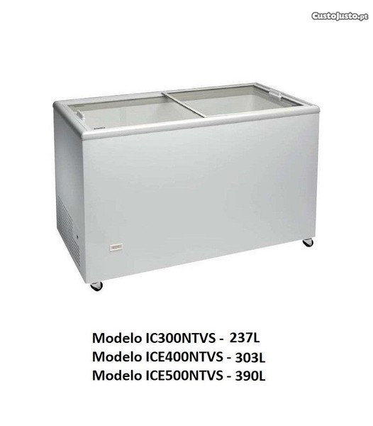 Descrição: Congeladores horizontais/arcas de congelação novas de várias capacidades com portas corredoras de vidro. Temperatura -18/-24C.