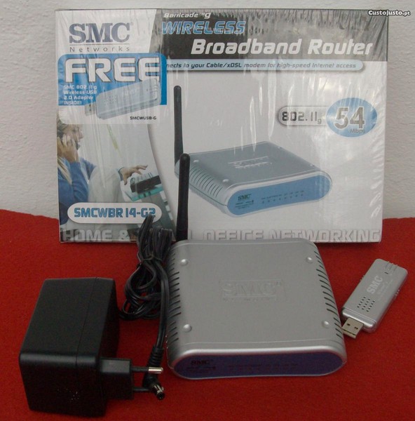 Router SMC + Pen USB SMC Artigo Original NOVO A embalagem contém: - 1 SMCWBR 14-G2 Wireless Barricade - 1 Pen SMC Ez Connect Wireless - 1 Tranformador AC/DC - 1 Cabo de rede Ethernet Condições de Envio e Pagamento - Entrega em mão em Évora - Grátis - Envio em Correio Normal após Trf. Bancária ou MBWAY - 2.25 Eur - Envio em Correio Registado após Trf. Bancária ou MBWAY - 4,80 Eur