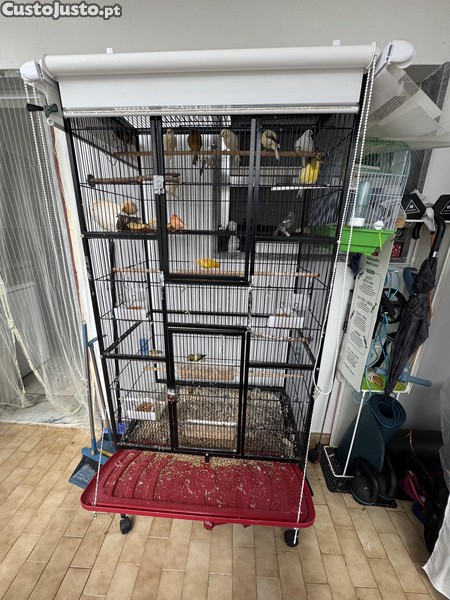 Acompanha jaula grande com rodas, prática e resistente, ideal para o conforto e mobilidade das aves.