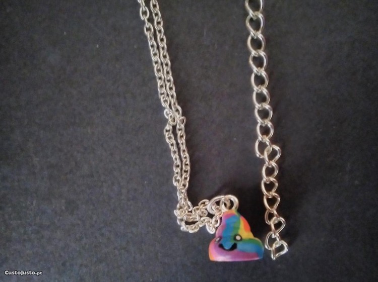 Colar prateado, tendo como pingente cocó colorido com carinha.