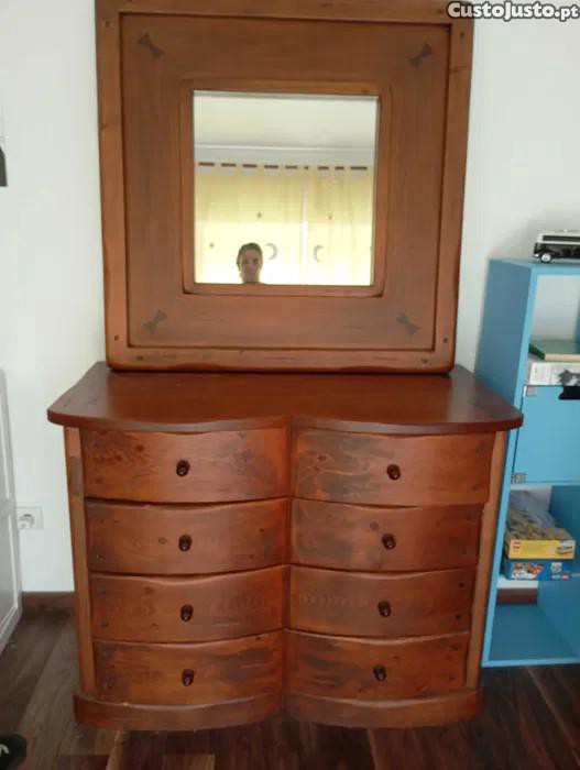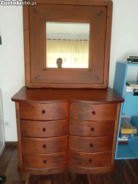 Cómoda de madeira maciça robusta de 4 gavetas espaçosas. Espelho de madeira igual à cómoda, grande, que podem ser vendidos separadamente. Como novos. 400 euros a cómoda e 100 euros o espelho.