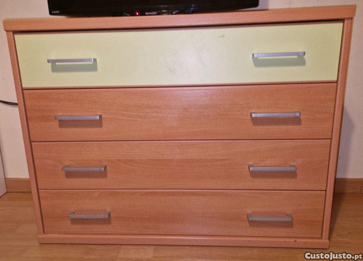 Este móvel de cómoda é ideal para o quarto das crianças. Feito de madeira com acabamento natural, possui 4 gavetas amplas para armazenar roupas, brinquedos e outros pertences. As pegas em metal prateado complementam o design moderno e funcional deste móvel usado, mas em bom estado de conservação. Transporte e montagem a cargo do comprador.