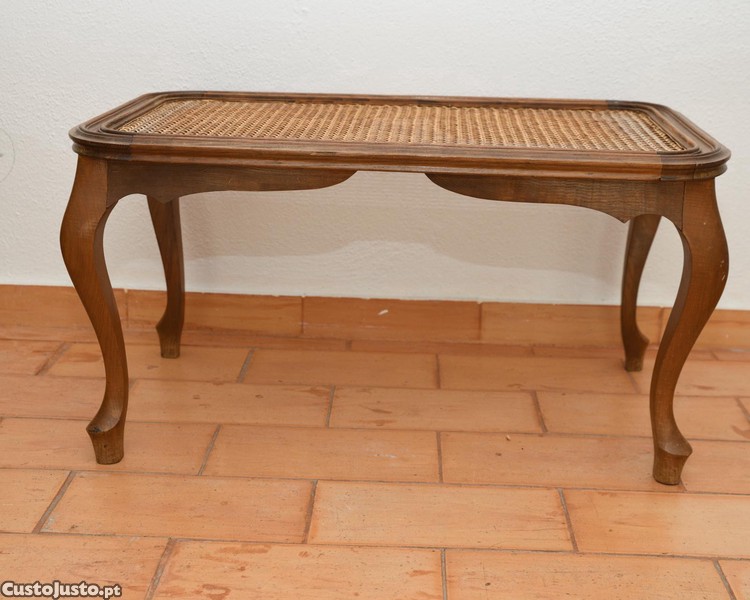 Mesa de centro de palhinha em madeira envelhecida, com design elegante e linhas clássicas. Ideal para complementar a decoração da sua sala de estar. Muito fácil de modernizar. Palhinha em bom estado. Dimensões: 0,80x0,46.