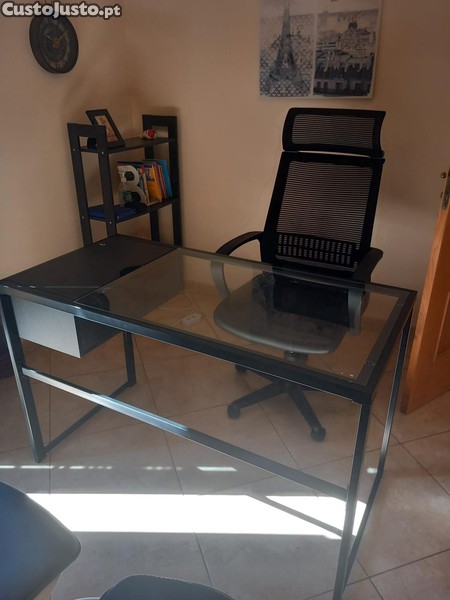 Mesa de escritório de vidro em bom estado de conservação de 120x60x76 cm. Estrutura metálica preta e tampo de vidro. Ideal para uso em escritório ou em casa. Dimensões e design modernos, com prateleira lateral para armazenamento. Móvel versátil e funcional.Também tem cadeira de escritorio.