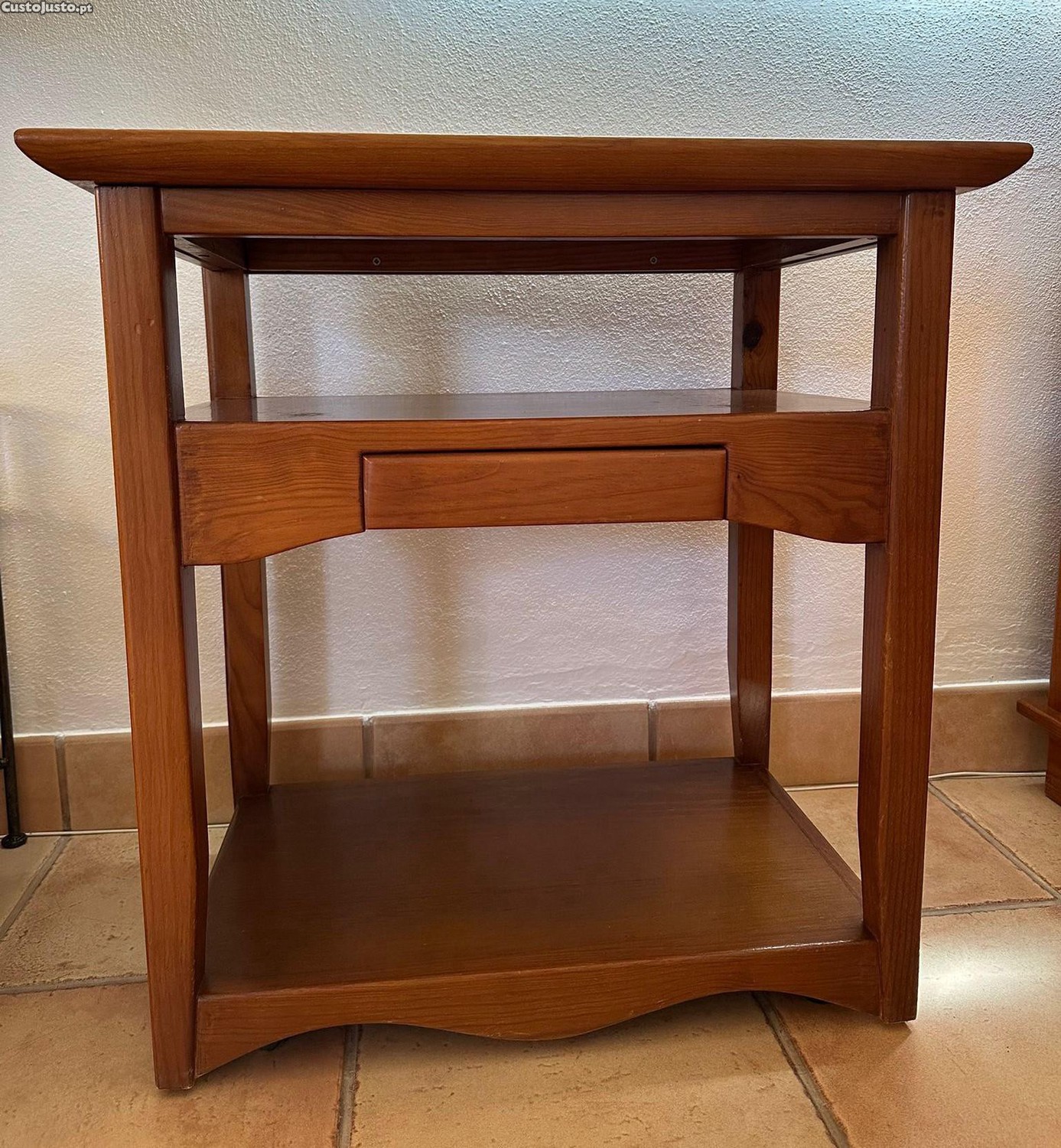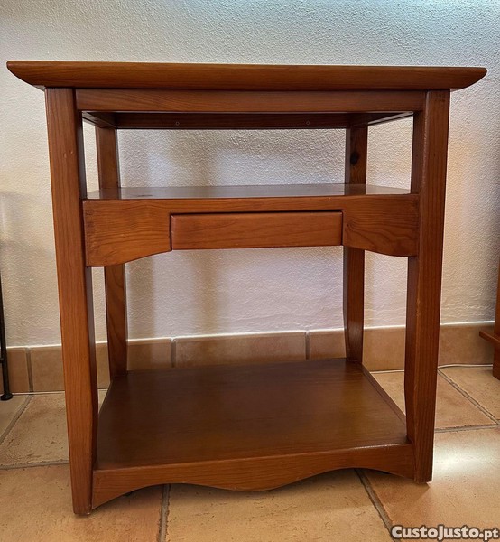 Mesa em madeira maciça, sólida e resistente, em excelente estado de conservação e com alta durabilidade. Tem rodas discretas que facilitam a mobilidade, além de uma prateleira inferior e uma gaveta central prática para arrumação.