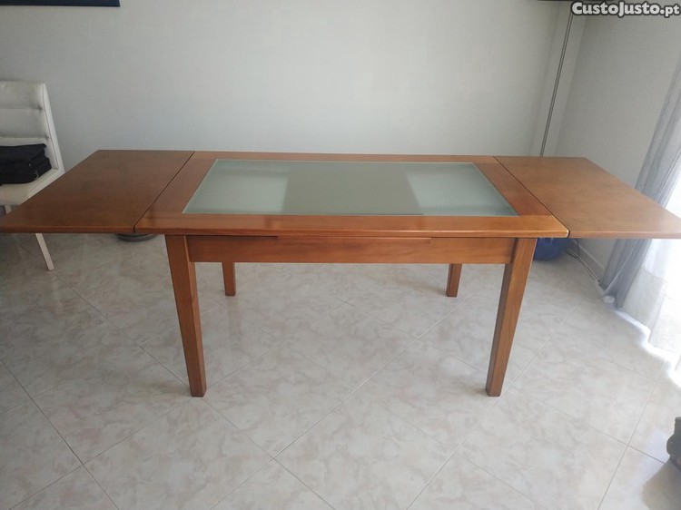 Mesa de Sala em madeira maciça e vidro. Comprimento 1,40m toda aberta 2,30m, largura 0,85m e altura 0,77m. Transporte a cargo do comprador.