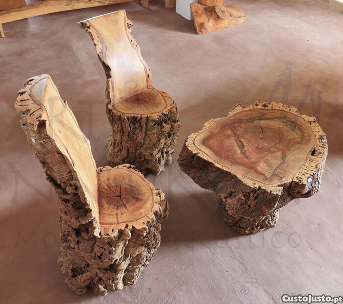 Conjunto de mesa e duas cadeiras de sobreiro.