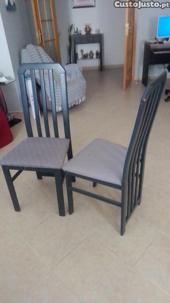 Vendo seis cadeiras de sala, de madeira lacada, cor cinzenta, usadas, com 1 metro de altura total, base a 46 cm de altura; a base tem 45 cm de largura e 40 cm de profundidade; algumas precisam de ser coladas e os assentos estofados.