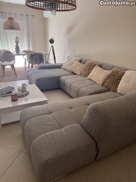 Sofá de cor cinzento de tecido, em bom estado com duas partes em lounge e bastante confortável . O comprimento é 3.40m, o lado esquerdo lounge comprimento 1.80 e lado direito Lounge 1.30. Ainda extensível a parte do meio em que fica uma cama .