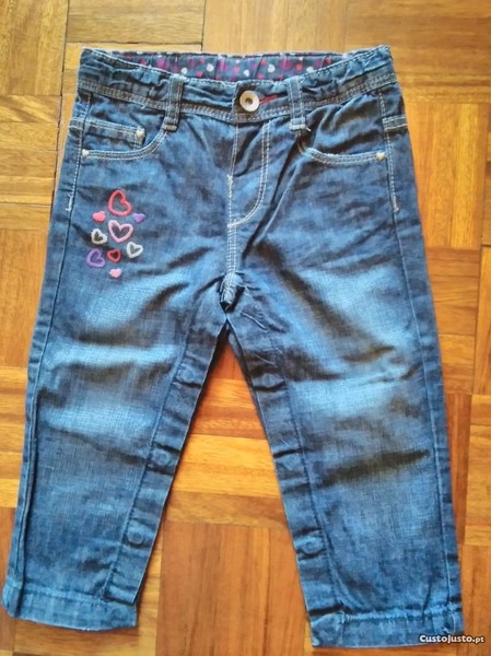 Calças de ganga para menina, com corações bordados na parte da frente e pequenos corações prateados aplicados na ponta dos bolsos.