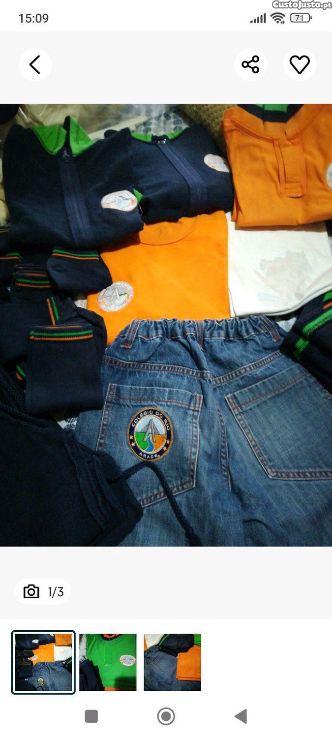 calções, calças de fato de treino, casaco com capuz, pólos, t-shirt, calça de ganga, meias curtas e compridas, pólos de manga comprida.Grande lote de roupa uniforme /farda colégio do Rio, composto por 1 casaco de fato de treino, 3 calças de fato de treino, 1 calças de ganga, 5 t-shirt laranja, 2 com a popota 1 swet de manga comprida, 2 pólos de manga curta, 2 pólos de manga comprida, 4 calções 4 pares de meias mais altas, 8 meias das curtas.