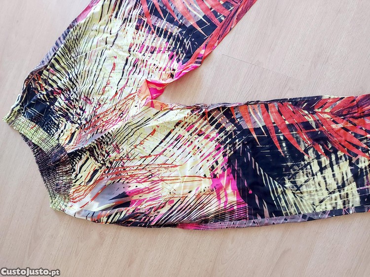 Calça comprida para o verão, tamanho L. Linda estampa multicolorida. - Tecido leve e fluido. - Cintura elástica para maior conforto. - Ideal para dias quentes.