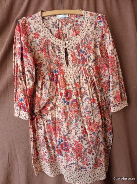 Vestido curto ou túnica bege, com flores vermelhas e azuis.