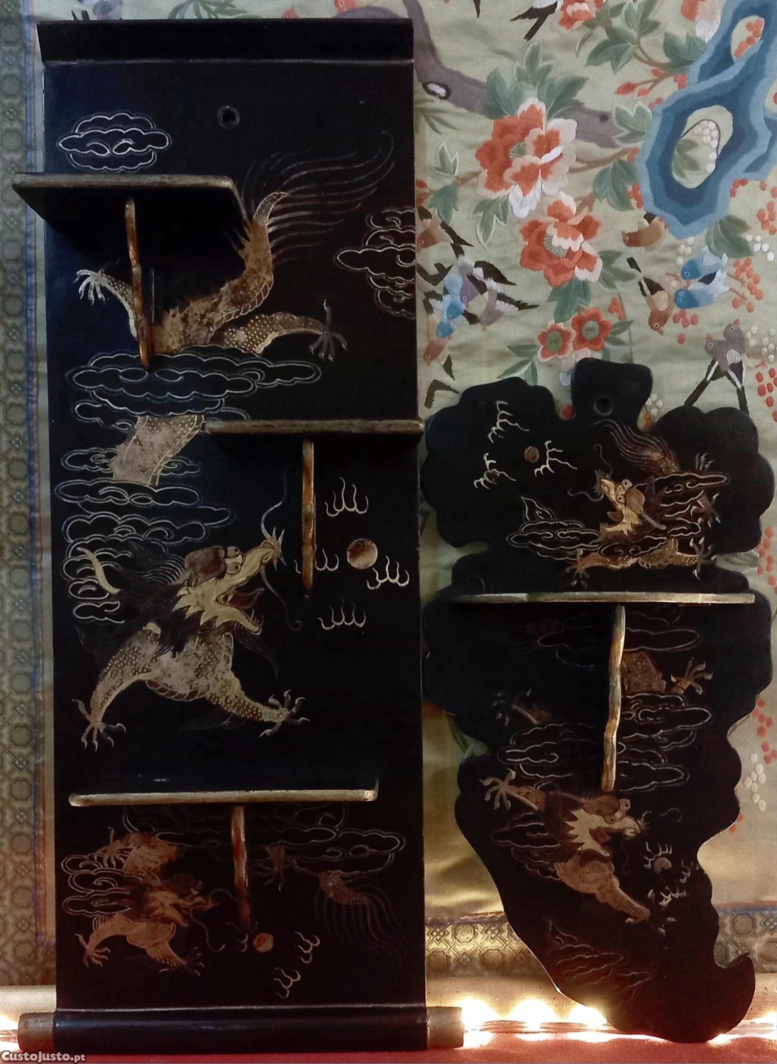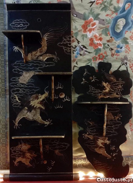 Bonito e Antigo Par de expositores Chineses, em madeira lacada, com pintura a Ouro, peças em bom estado.