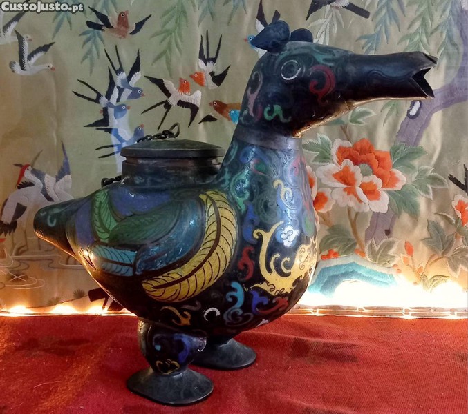 Preço: 335 €Bonito e Antigo queimador de Incenso Chines, Peça em Bronze Closonne, em Forma de Pato,